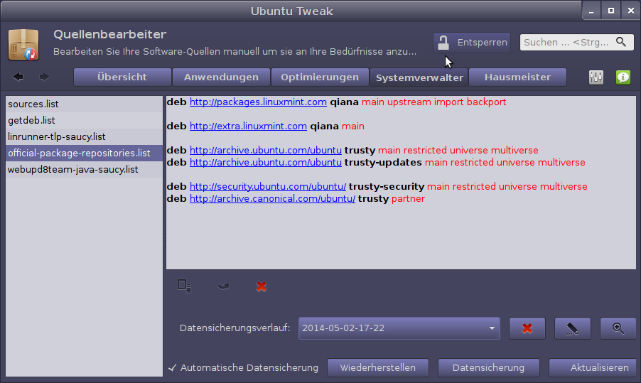 Selbst angelegte ppa oder andere Quellen werden beim upgrade auf Mint 18, Mint 19 bzw. Mint 20 deaktiviert und als Backup im Persönlichen Ordner unter Upgrade-Backup gesichert und können nach Anpassung auf xenial bzw. 16.04, bionic bzw. 18.04, focal bzw. 20.04 oder jammy bzw. 22.04, wieder in /etc/apt/sources.list.d oder in Anwendungspaketquellen eingefügt werden.